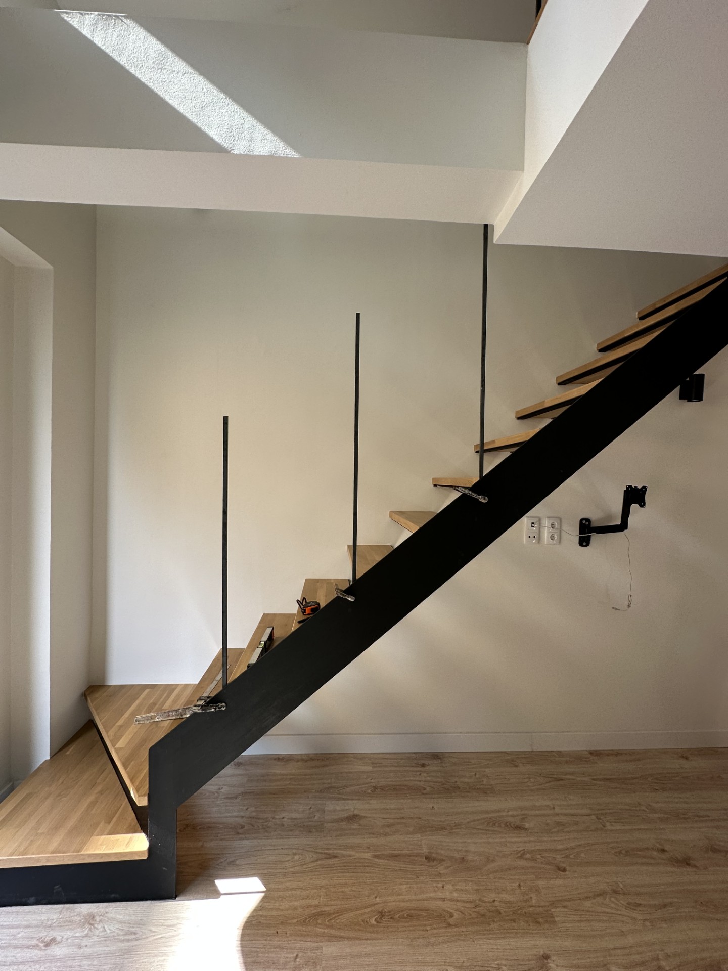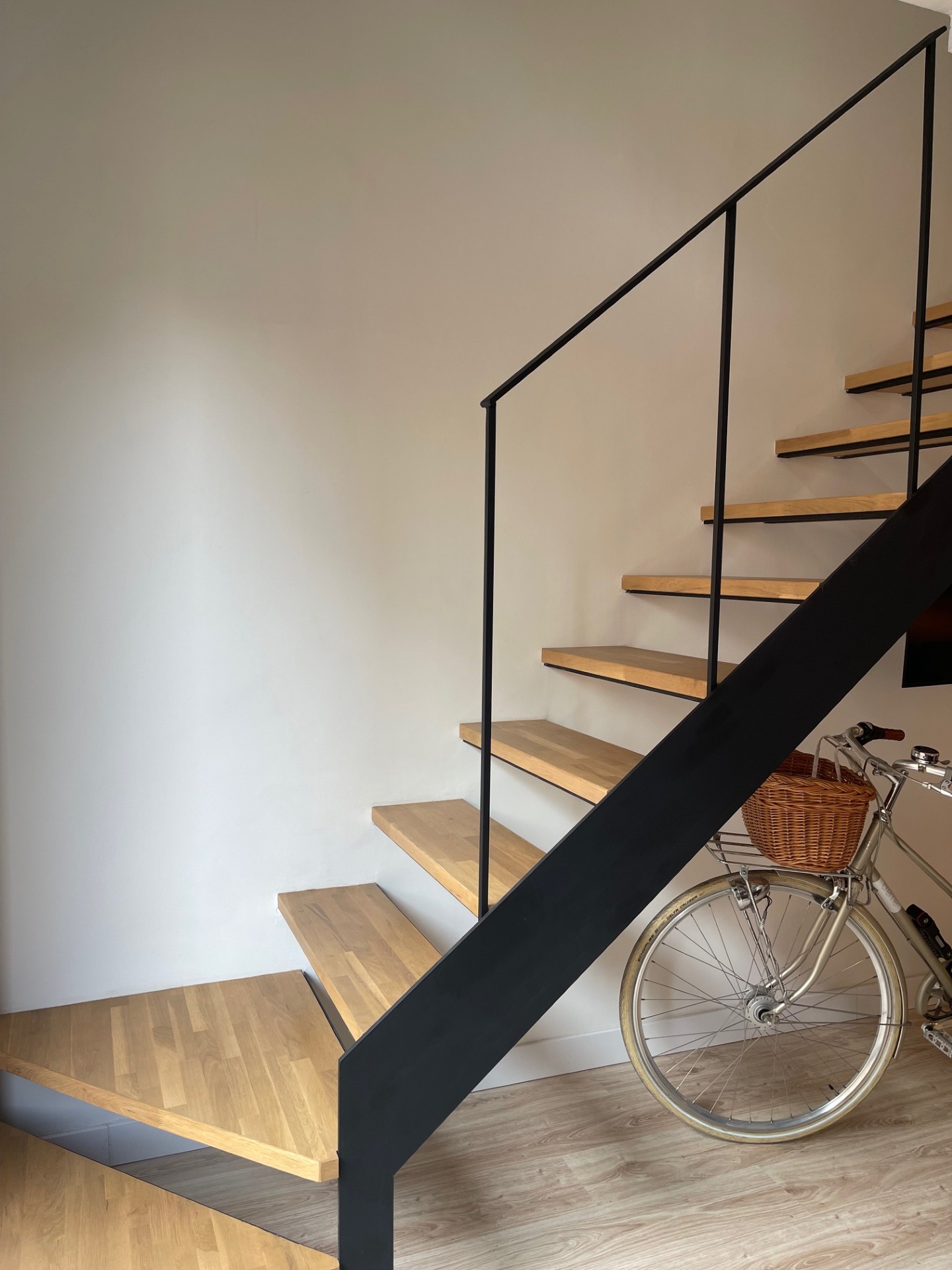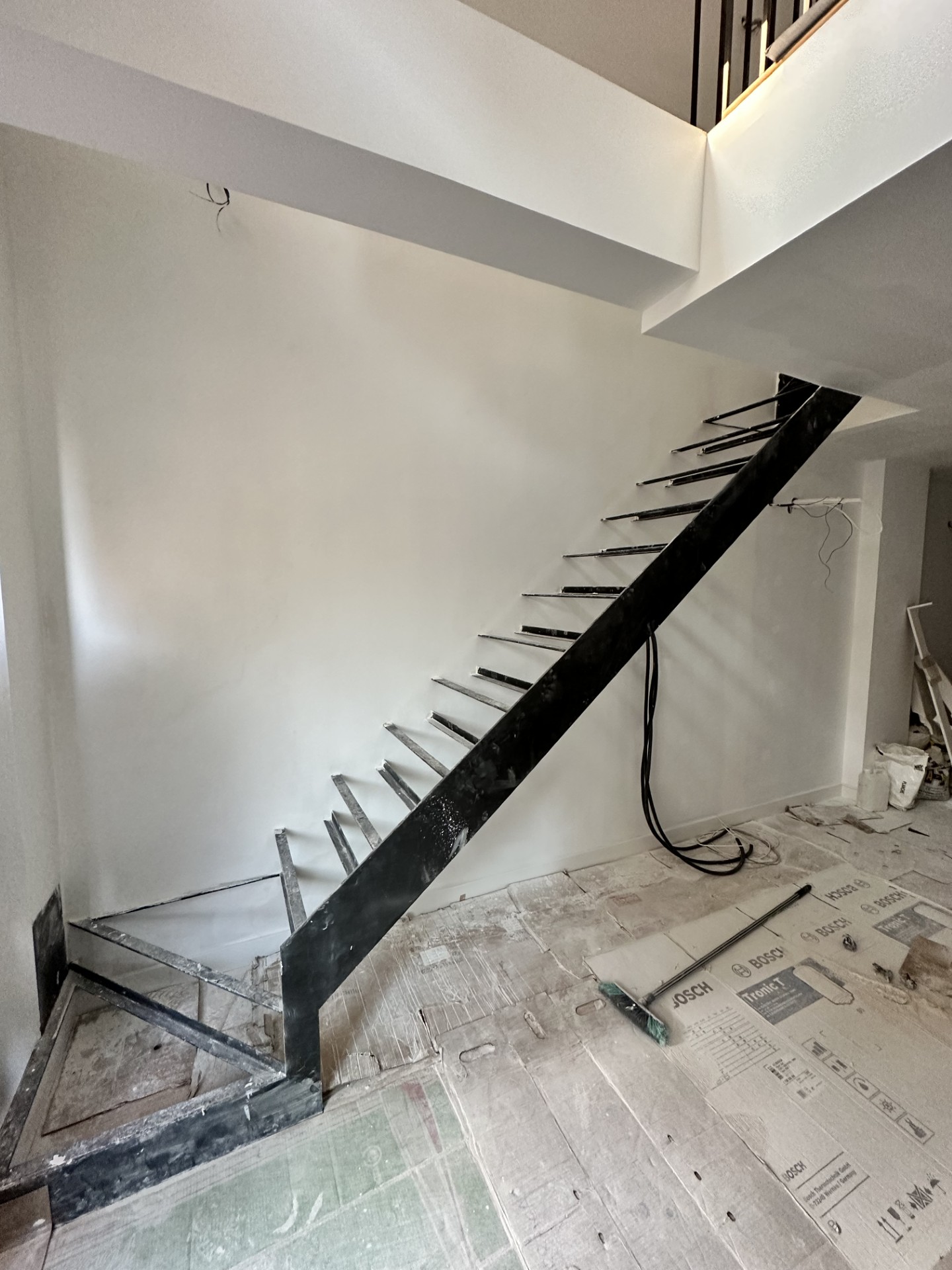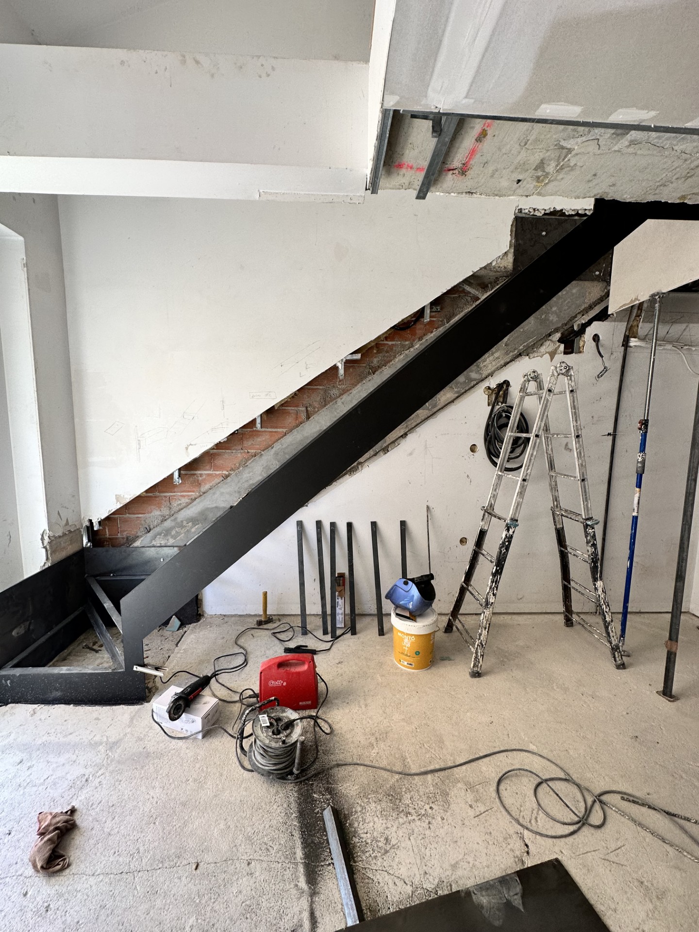 El diseño de la escalera fue un elemento clave; utilizamos materiales como madera, acero y vidrio para mantener la transparencia y permitir el paso de luz. La reforma también incluye mejoras en eficiencia energética y acabados que refuercen la luminosidad, garantizando un entorno moderno y funcional.