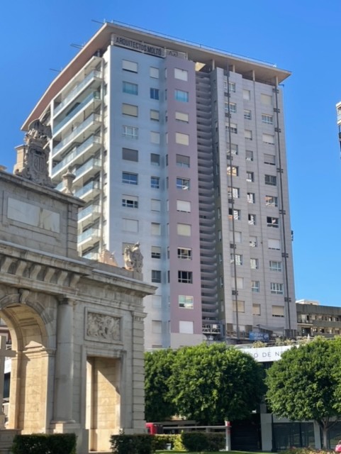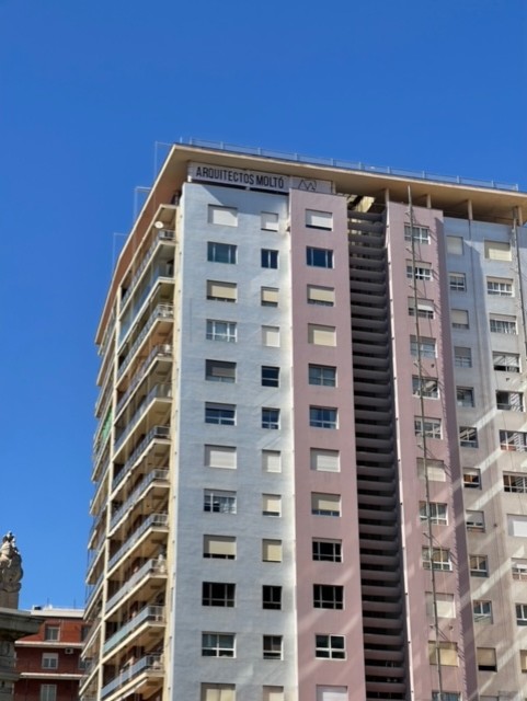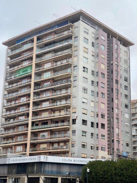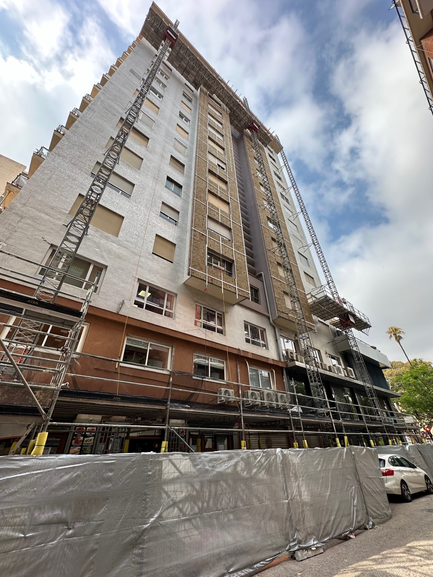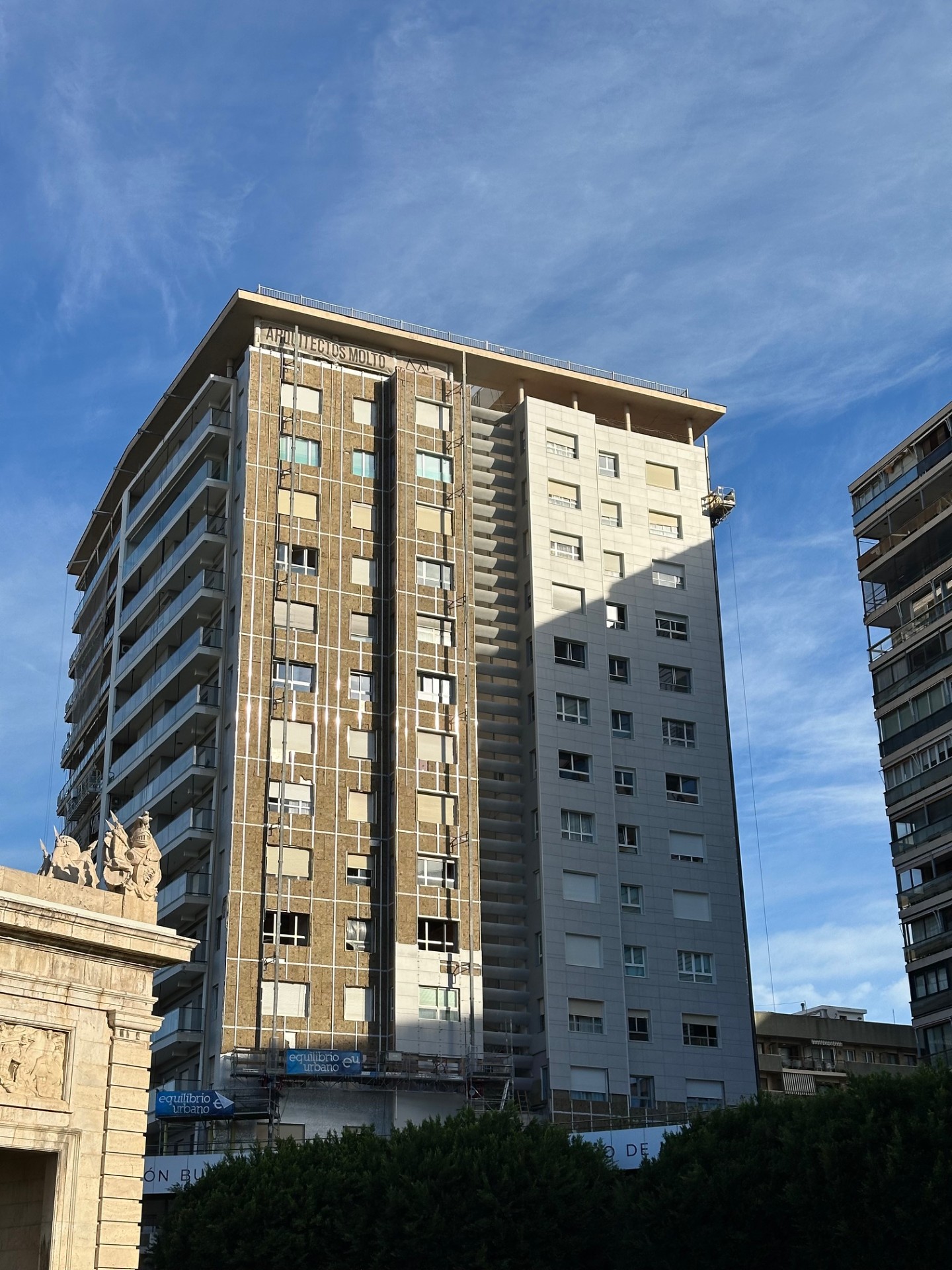 El proyecto de rehabilitación integral de uno de los edificios más icónicos del centro de Valencia busca revalorizar su presencia y optimizar su rendimiento energético. Se interviene en toda la envolvente mediante dos soluciones innovadoras: una fachada ventilada con cerámica de gran formato y un sistema de aislamiento térmico exterior (SATE). Las barandillas de los balcones se renuevan, y la fachada se reviste en tonos grises y blancos, aportando una estética contemporánea. En la cubierta transitable, se instalan paneles solares que reducen significativamente el consumo eléctrico comunitario.