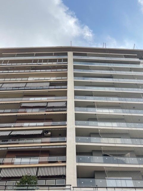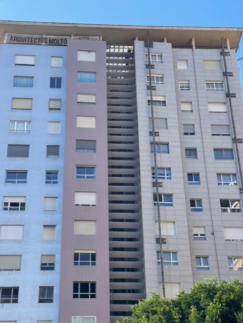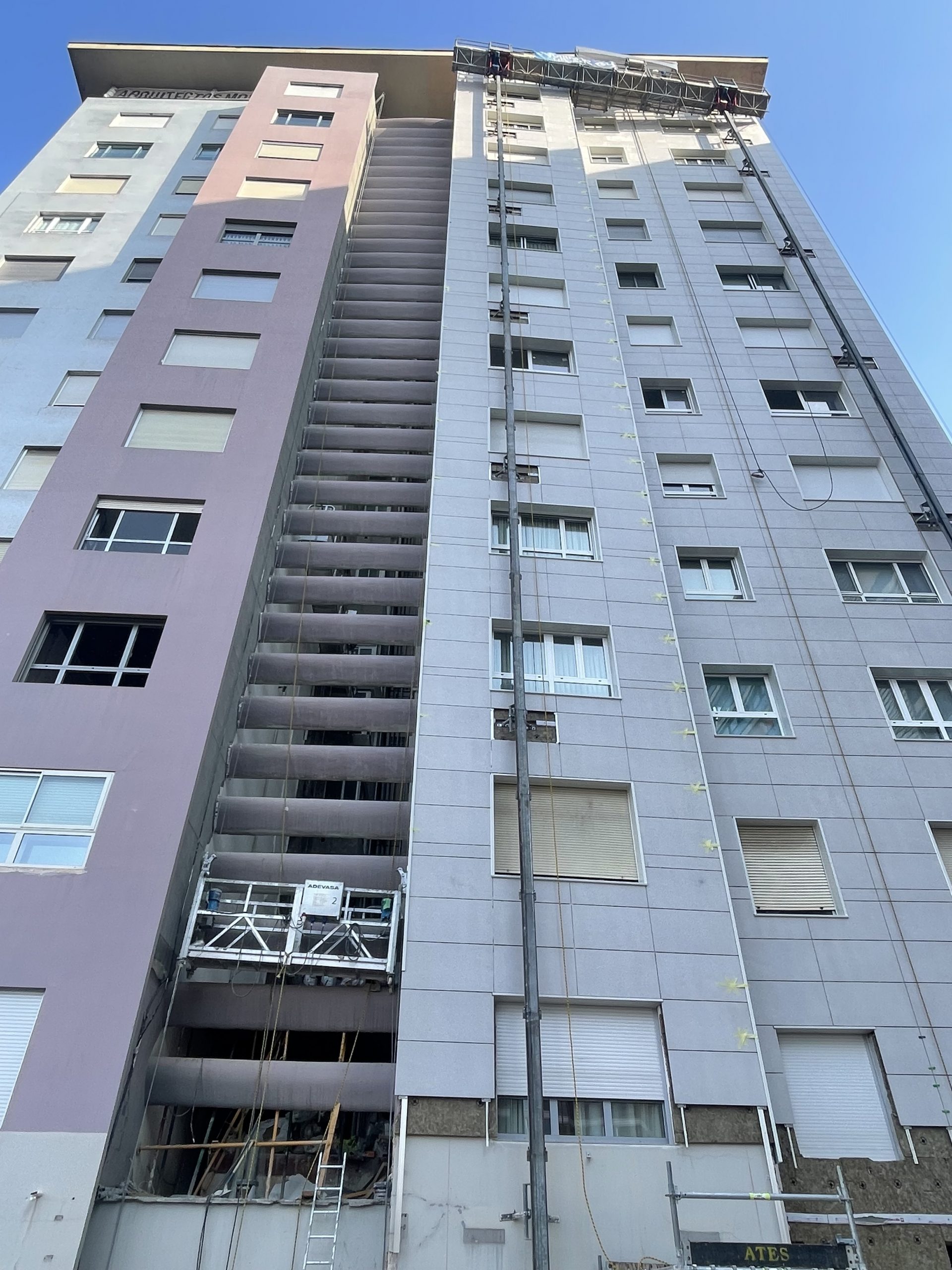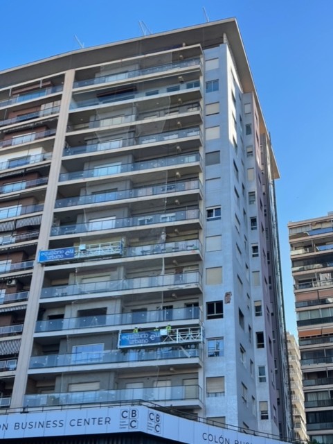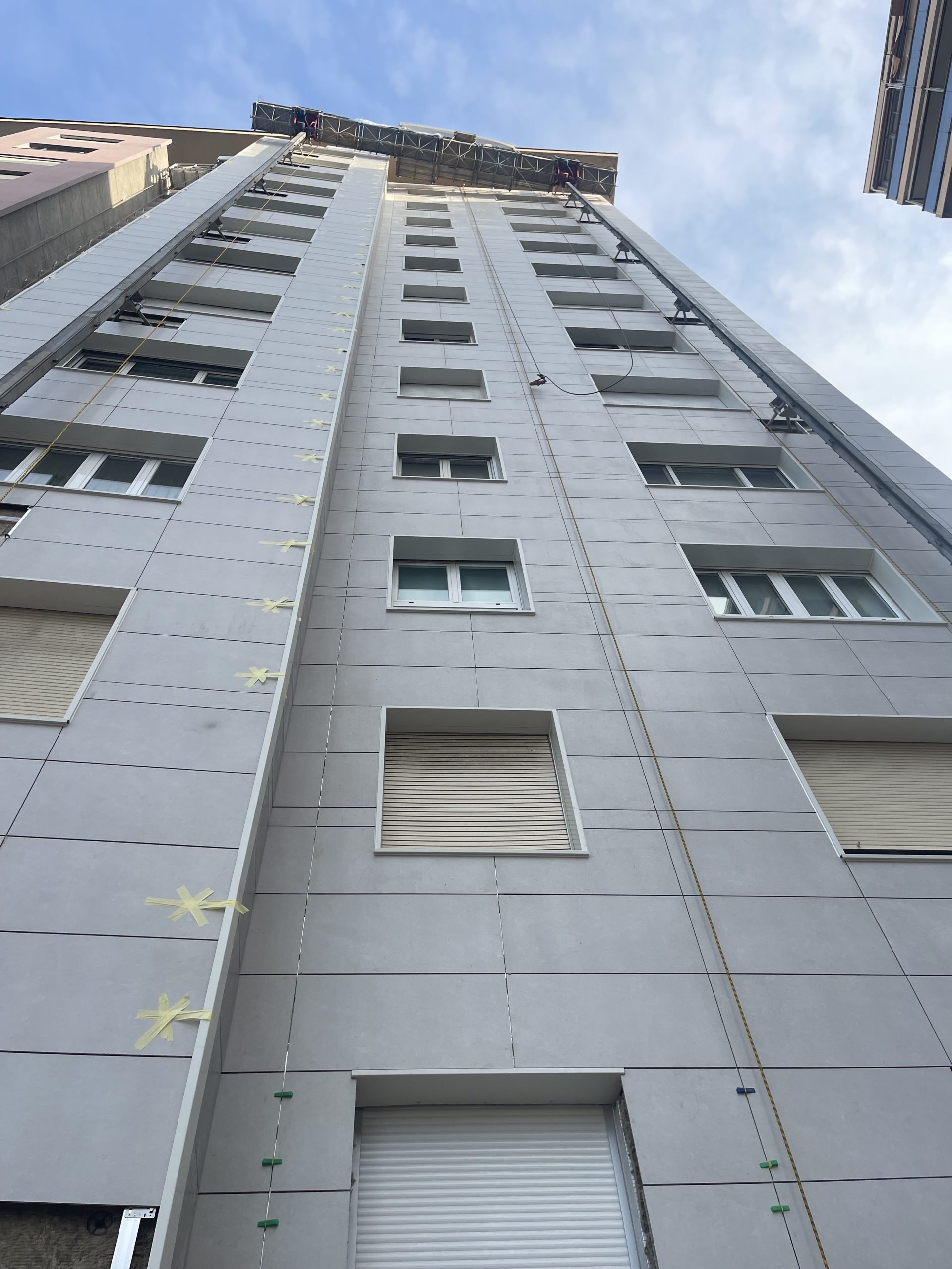 El proyecto de rehabilitación integral de uno de los edificios más icónicos del centro de Valencia busca revalorizar su presencia y optimizar su rendimiento energético. Se interviene en toda la envolvente mediante dos soluciones innovadoras: una fachada ventilada con cerámica de gran formato y un sistema de aislamiento térmico exterior (SATE). Las barandillas de los balcones se renuevan, y la fachada se reviste en tonos grises y blancos, aportando una estética contemporánea. En la cubierta transitable, se instalan paneles solares que reducen significativamente el consumo eléctrico comunitario.