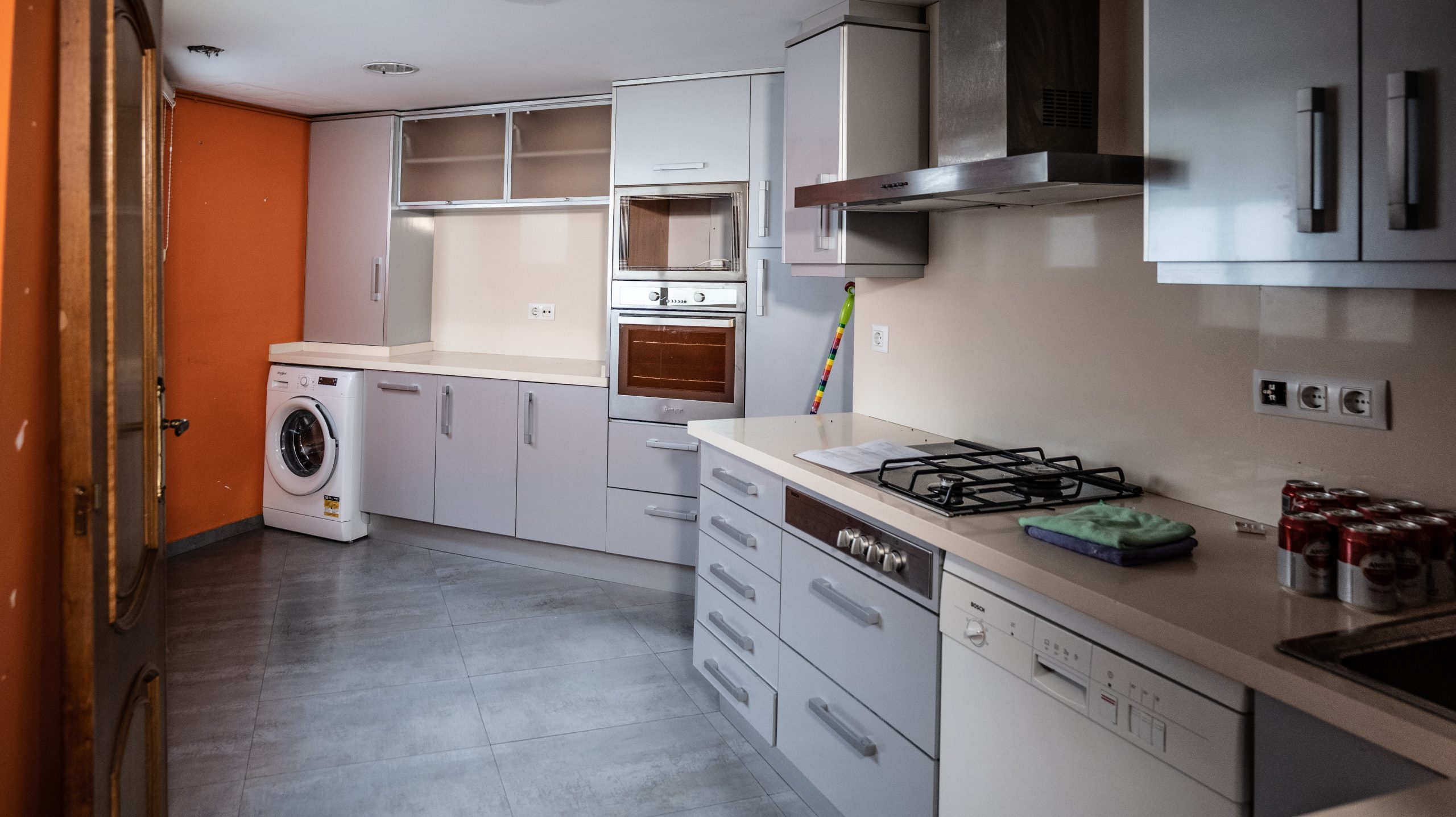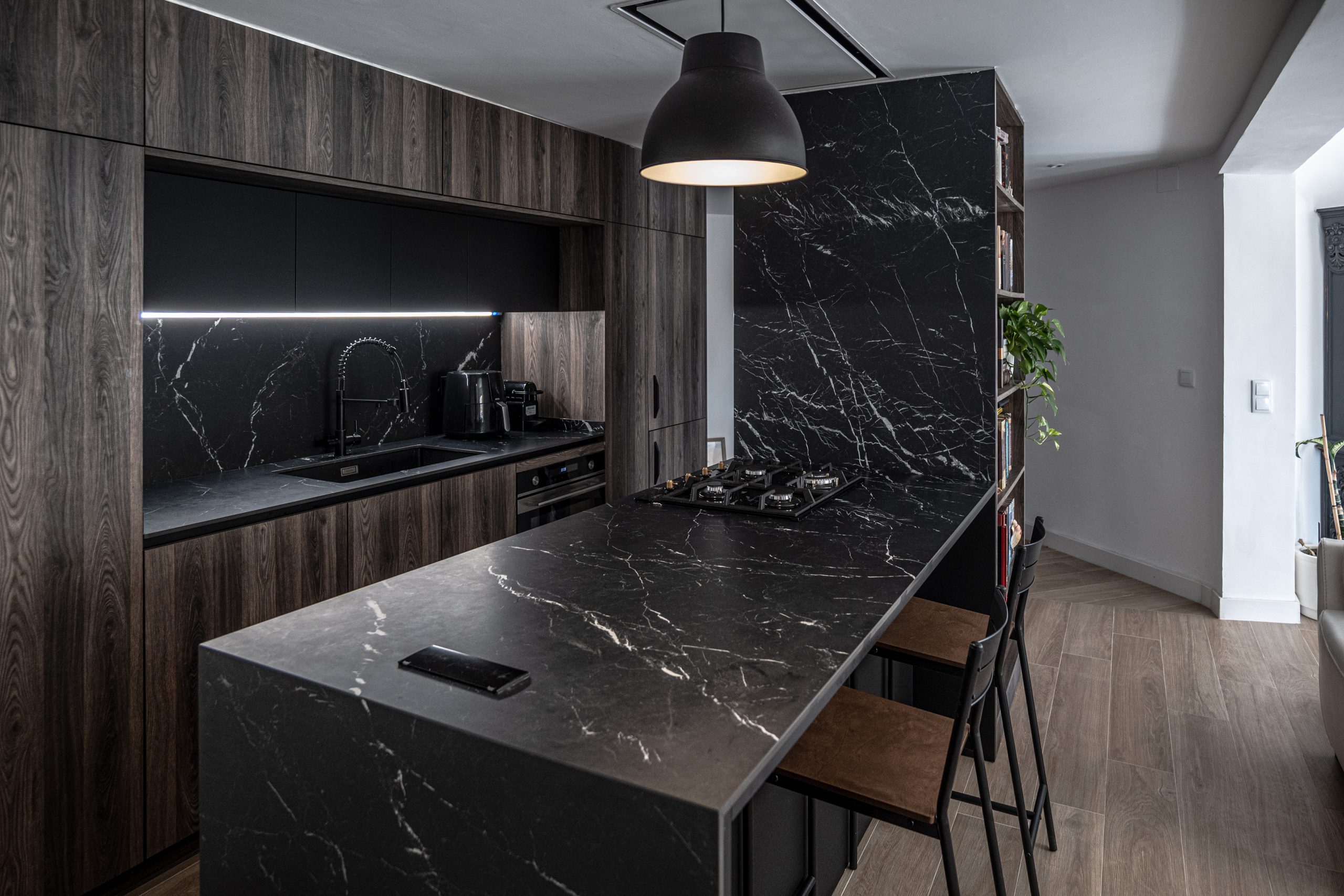 La cocina se diseñó con una bancada lineal que integra armarios de suelo a techo para maximizar el almacenamiento, y una isla paralela que también amplía el espacio de almacenaje y alberga la zona de cocción. Todo el mobiliario fue hecho a medida, utilizando equipamiento de última generación y materiales de alta calidad. Esta intervención no solo optimiza la funcionalidad de los espacios, sino que también equilibra estética y practicidad, creando un ambiente moderno y acogedor que responde a las expectativas del cliente.
